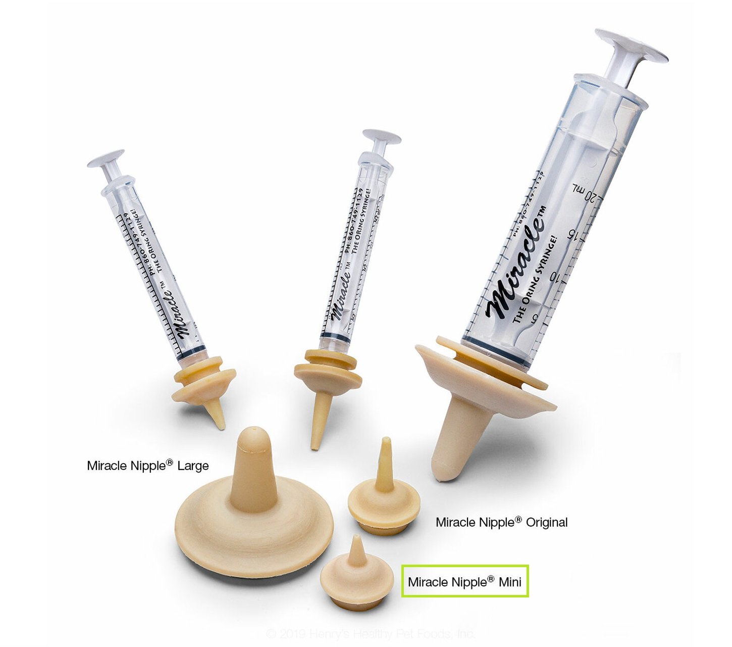 Barošanas komplekts MIRACLE NIPPLE -MINI izmērs, kas domāts jaundzimušiem dzīvniekiem: vāverēm, kaķiem, (it sevišķi kaķiem ar šķirnes īpatnību- plakanu purnu), trušiem, pelēm, mini un mazo šķirņu suņiem, kā arī suņiem ar īsu purnu.