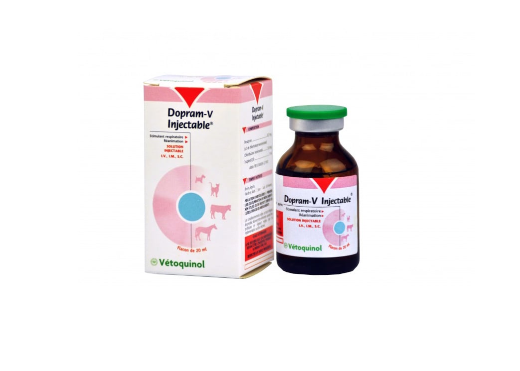 Dopram-V Injectable šķīdums injekcijām zirgiem, govīm, suņiem, kaķiem.