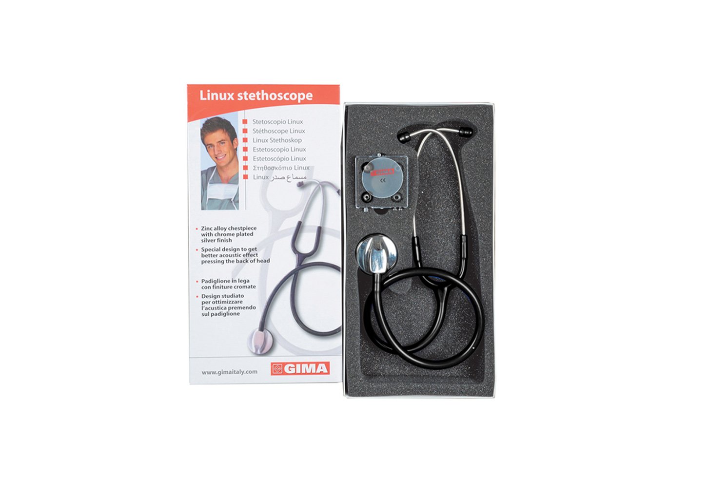Vienpusējs fonendoskops ar vieglu cinka sakausējuma krūšu daļu, kas pārklāta ar satīna apdari.