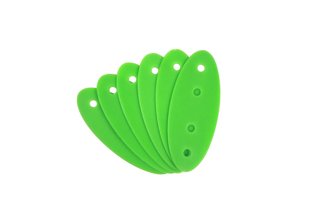 Pogas ir no plastikāta izgatavota plakana, ovāla plāksnīte ar apaļiem caurumiem.