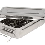 Nerūsējošā tērauda sterilizators ar vāku un rokturiem.