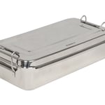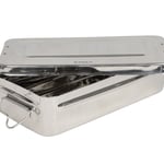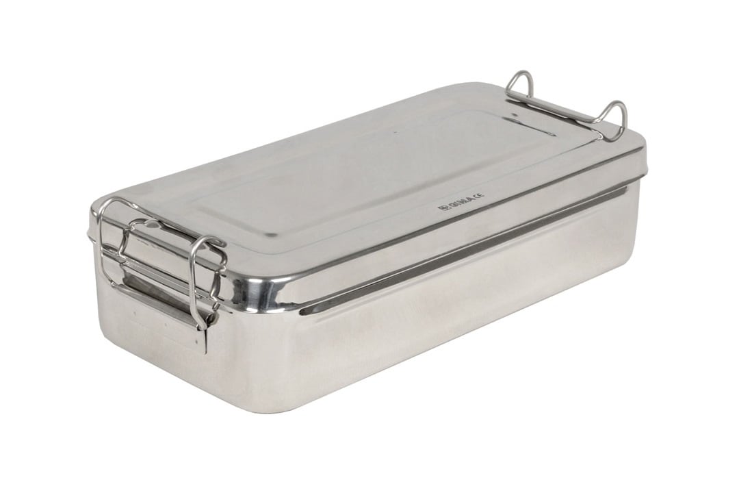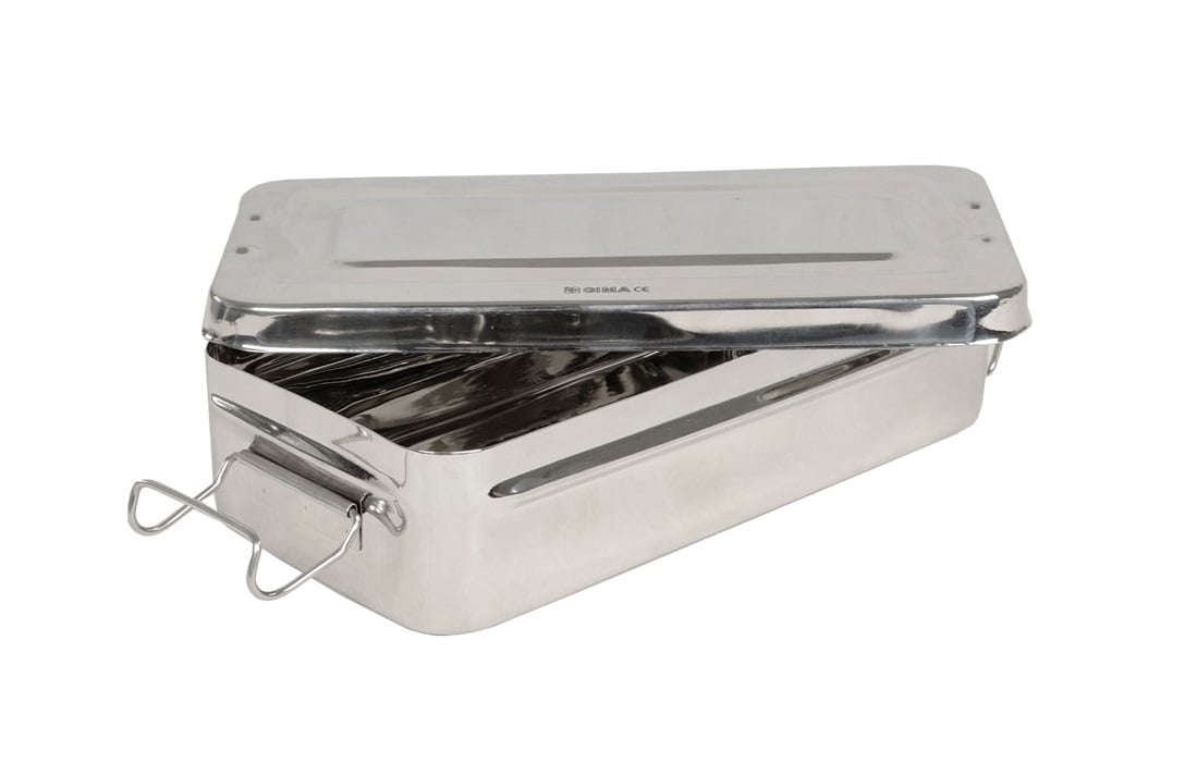 Nerūsējošā tērauda sterilizators ar vāku un rokturiem.
