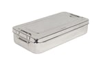 Nerūsējošā tērauda sterilizators ar vāku un rokturiem.