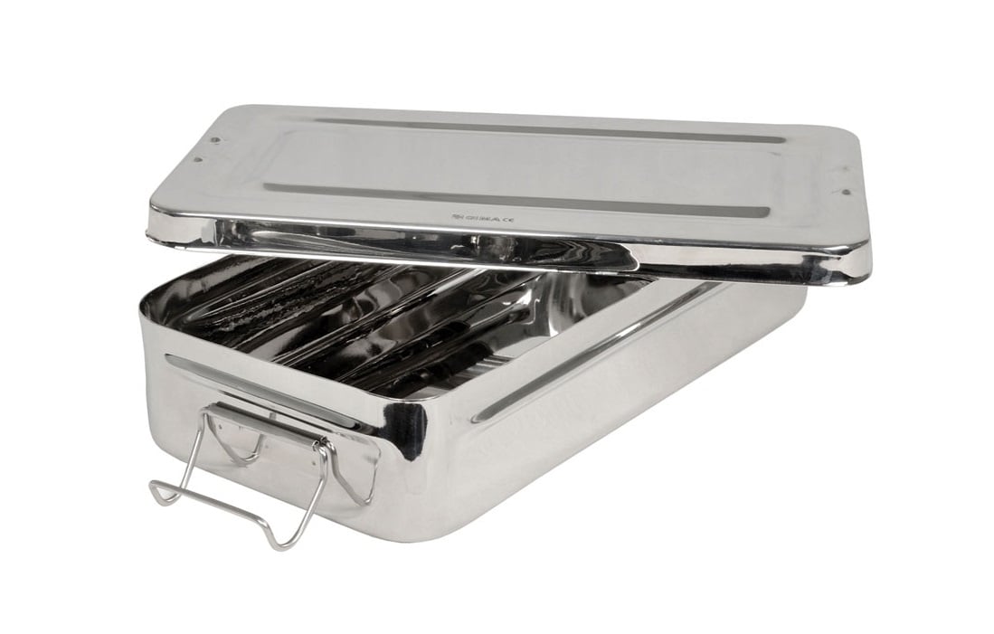 (+371) 20403311Nerūsējošā tērauda sterilizators ar vāku un rokturiem.