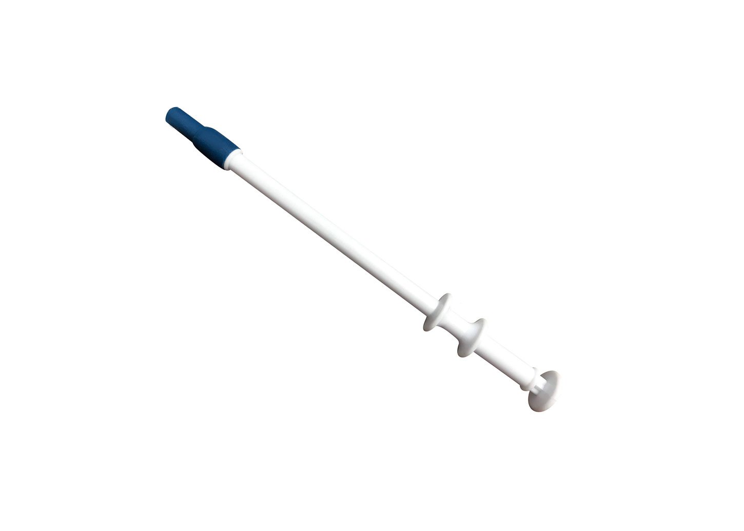 Plastmasas tablešu devējs ar garu rokturi un gumijas uzgali.