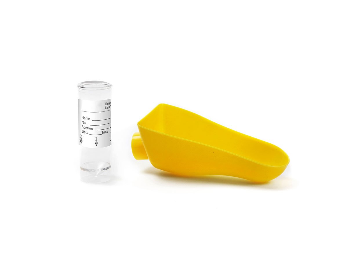 Ērta piltuvīte urīna parauga savākšanai un trauciņš urīna transportēšanai.